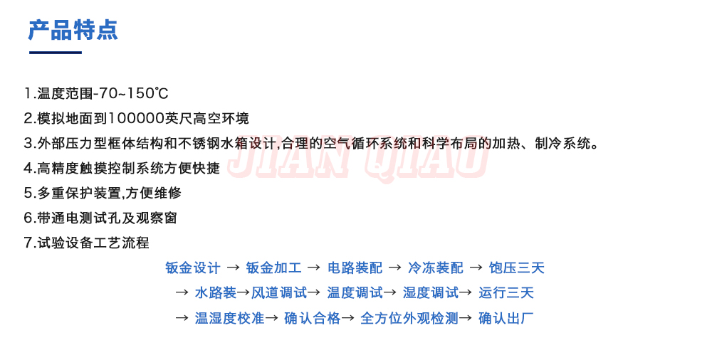 用途:高低溫低氣壓試驗箱主要用于試驗工件在低氣壓、高溫低溫單項或同時作用下的環境適應性與可靠性試驗,并或同時對試件通電進行電氣性能參數的測量。