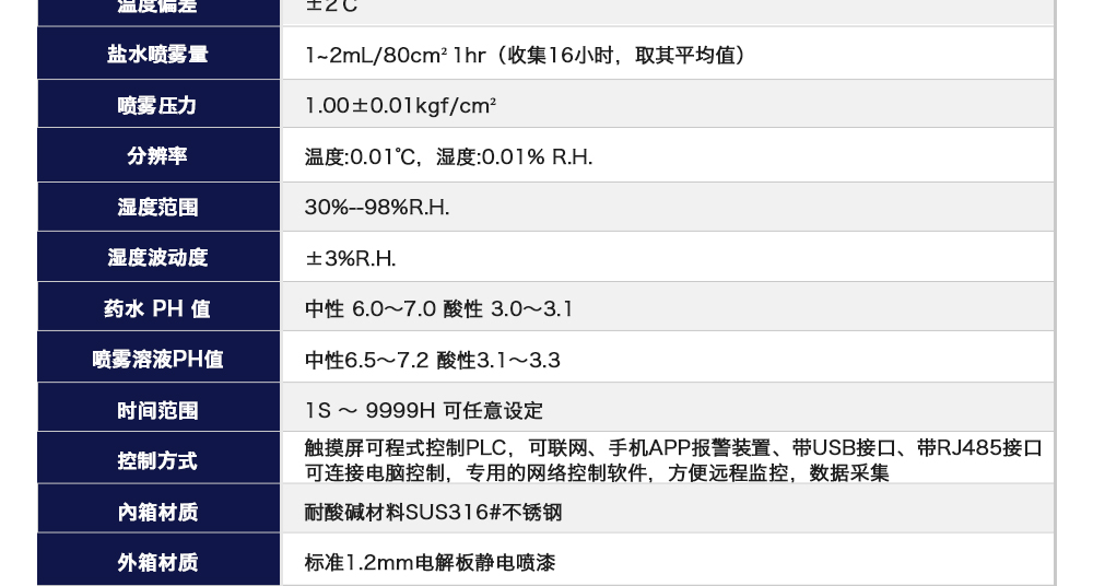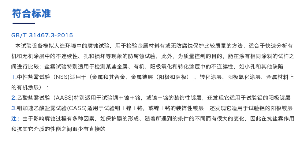 用途:復(fù)合鹽霧試驗(yàn)箱是測試蓄電池包或系統(tǒng)外殼在一定濃度下放置一定時(shí)間,其耐腐蝕程度同時(shí)也可用于各種材質(zhì)之表面經(jīng)電鍍、陽極處理、噴涂、防銹油等腐蝕處理后,測試其制品之耐蝕