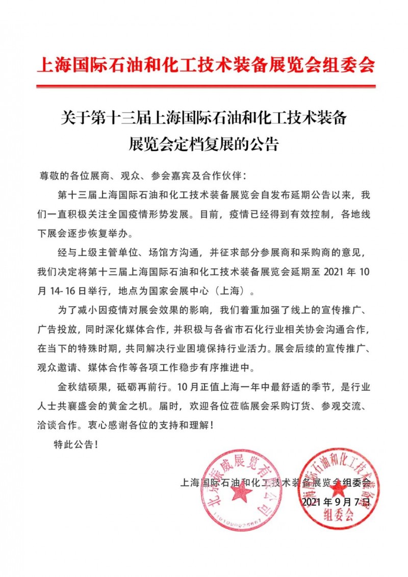 受新冠肺炎疫情安全防控因素影響,原定于2021年8月25-27日在上海新國際博覽中心舉辦的第十三屆上海國際石油和化工技術(shù)裝備展覽會(huì)(cippe2021上海石化展)將于2021年10月14-16日移師至國家會(huì)展中心(上海)舉辦,歡迎您屆時(shí)參展參觀。