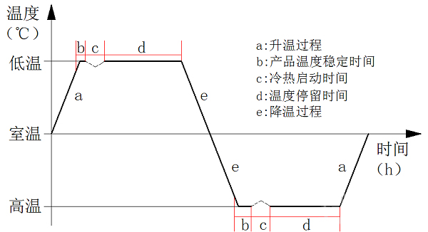 熱循環(huán)試驗是一種利用高低溫交變濕熱試驗箱對試驗產(chǎn)品進(jìn)行的預(yù)設(shè)高低溫交替的應(yīng)力考核,用以驗證材料和產(chǎn)品是否達(dá)到在研發(fā)、設(shè)計、制造中預(yù)期的質(zhì)量目標(biāo)的一類可靠性試驗。通過大溫變速率可暴露產(chǎn)品潛在的材料與性能缺陷,經(jīng)過不斷地質(zhì)量改進(jìn),達(dá)到可靠性提升的目的。航天單機(jī)類產(chǎn)品一次熱循環(huán)示意圖見下圖1所示。