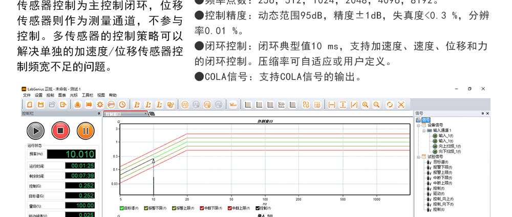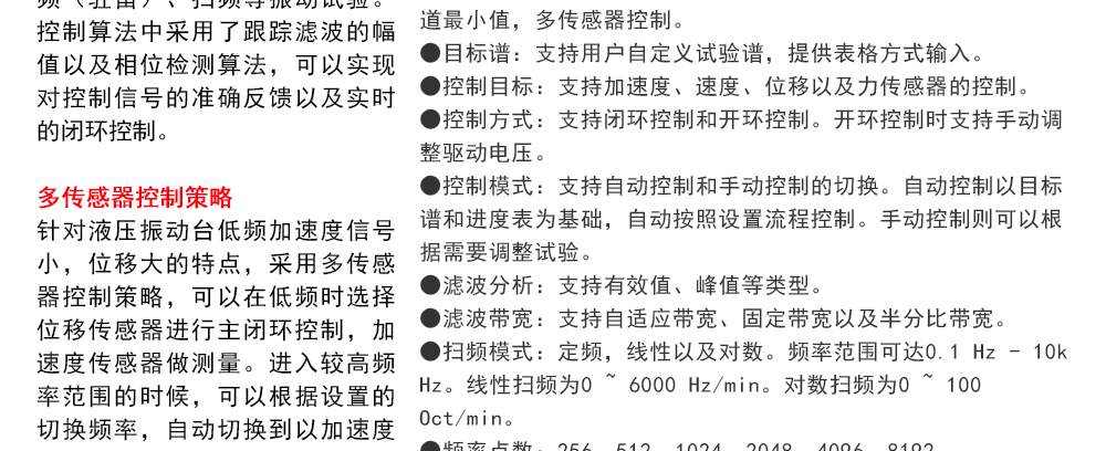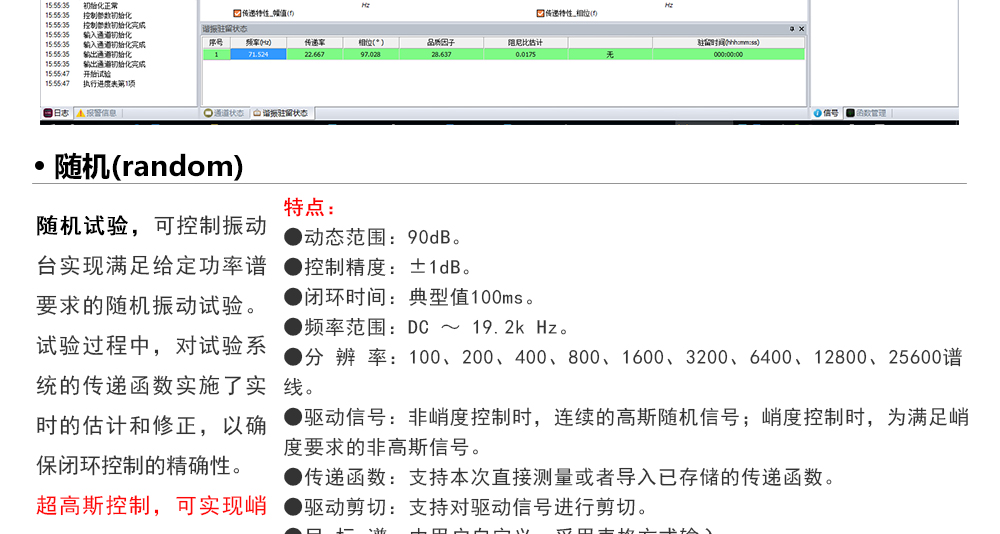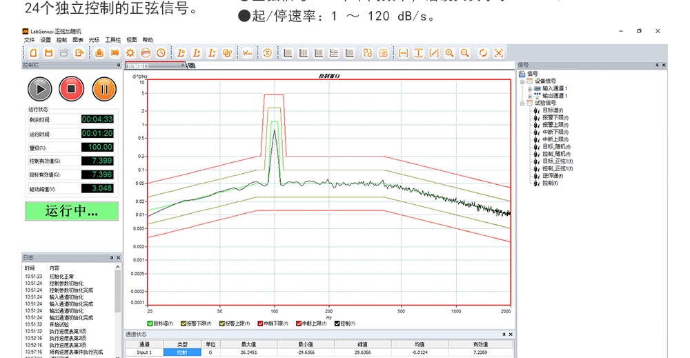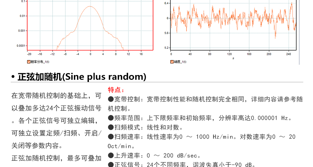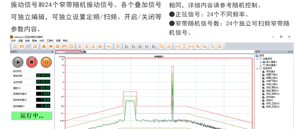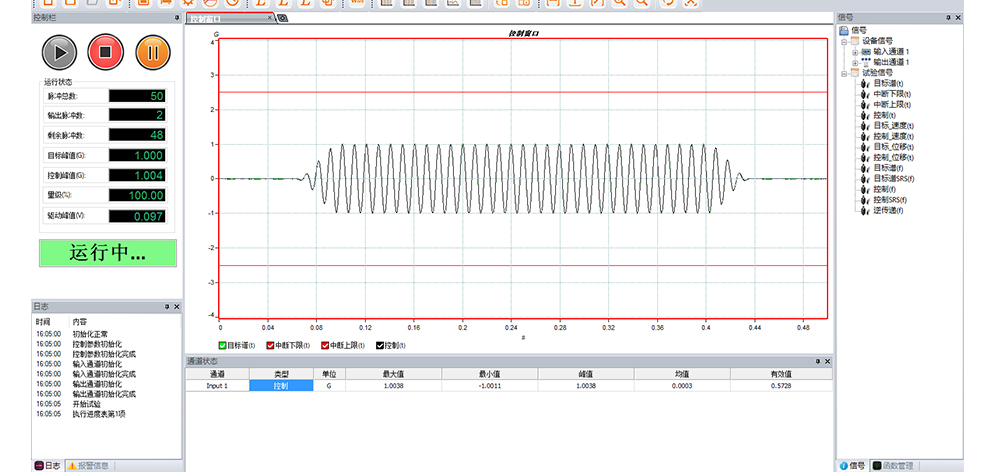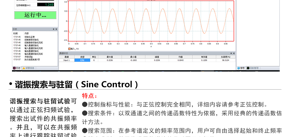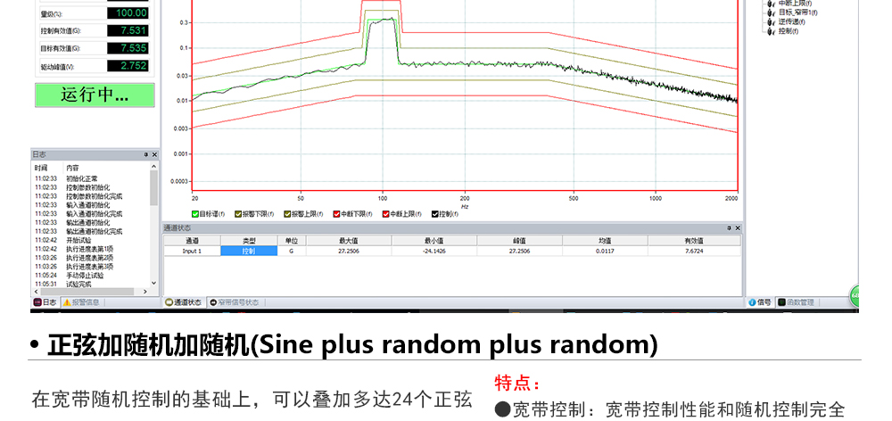 用途:正弦試驗(yàn)可以控制振動(dòng)臺實(shí)現(xiàn)定頻(駐留)、掃頻等振動(dòng)試驗(yàn)。控制算法中采用了跟蹤濾波的幅值以及相位檢測算法,可以實(shí)現(xiàn)對控制信號的準(zhǔn)確反饋以及實(shí)時(shí)的閉環(huán)控制。