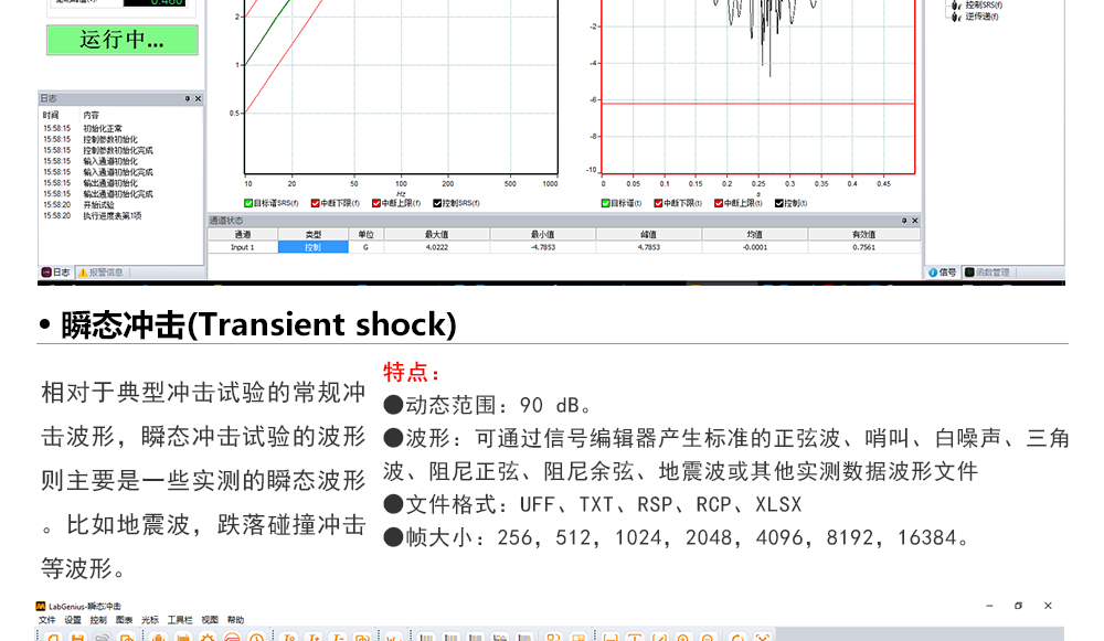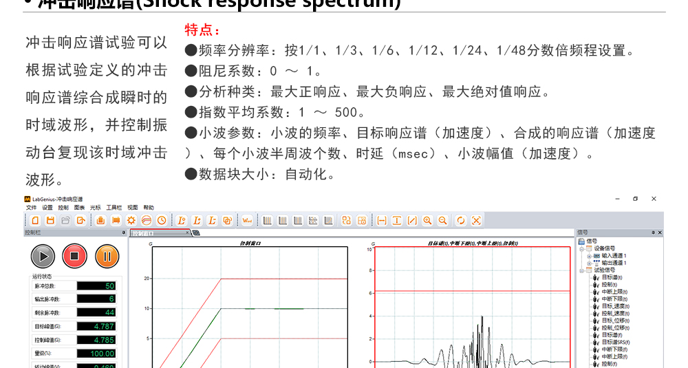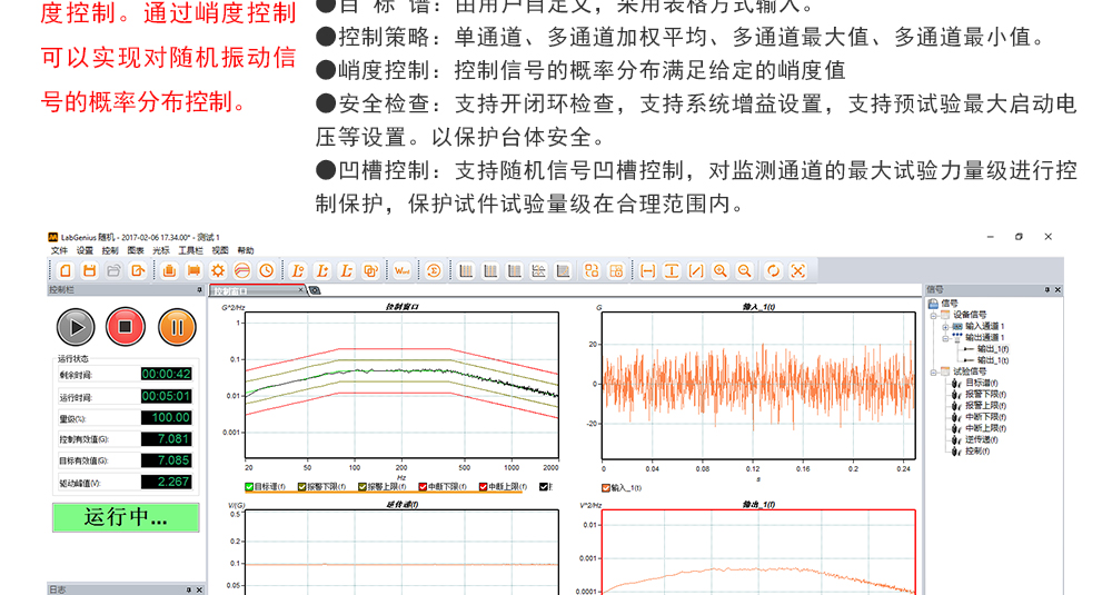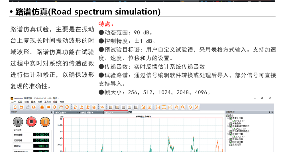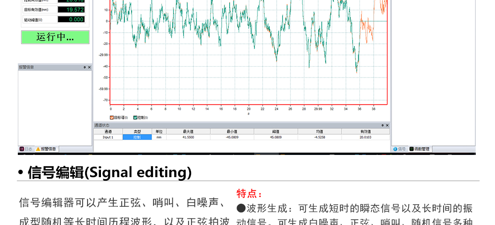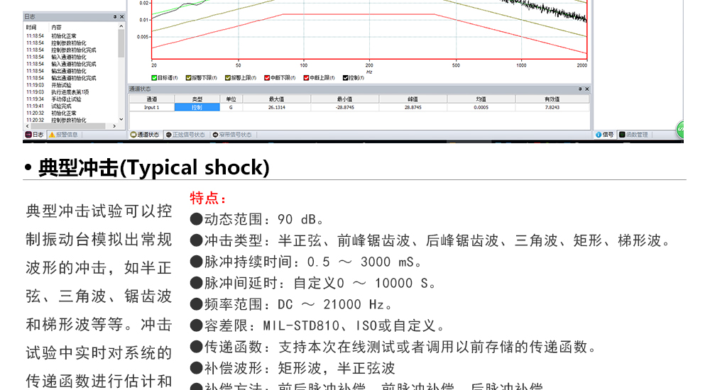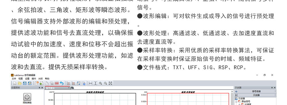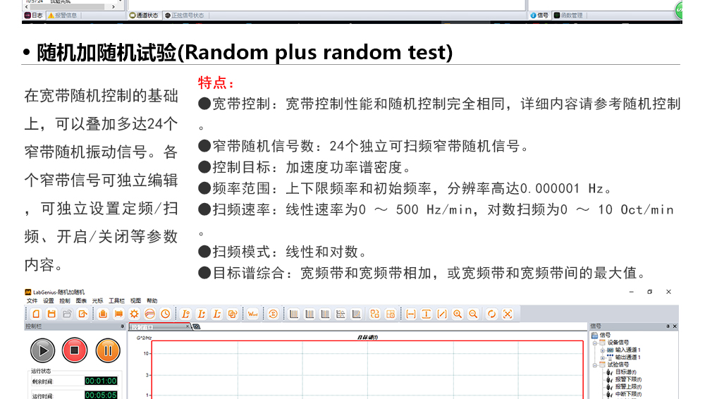 用途:正弦試驗(yàn)可以控制振動(dòng)臺實(shí)現(xiàn)定頻(駐留)、掃頻等振動(dòng)試驗(yàn)。控制算法中采用了跟蹤濾波的幅值以及相位檢測算法,可以實(shí)現(xiàn)對控制信號的準(zhǔn)確反饋以及實(shí)時(shí)的閉環(huán)控制。