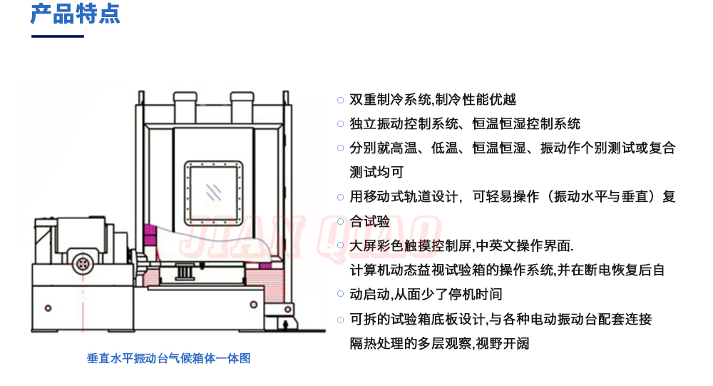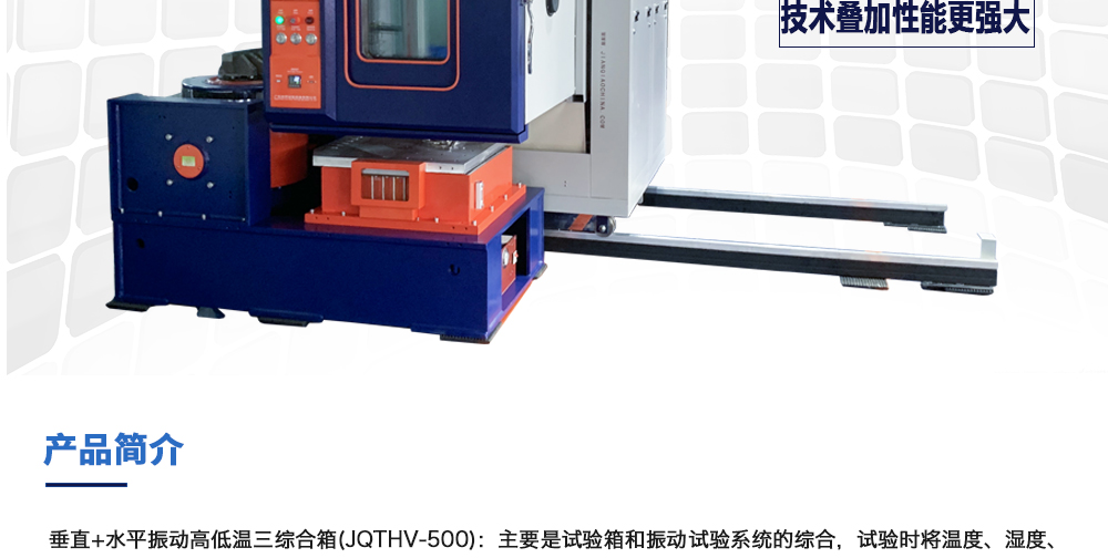 用途:垂直+水平振動高低溫三綜合箱(JQTHV-500):主要是試驗箱和振動試驗系統(tǒng)的綜合,試驗時將溫度、濕度、振動(高溫或低溫),(正弦振動或隨機振動)以及電應(yīng)力按規(guī)定的周期綜合在同一氣候試驗箱中施加到樣品上進(jìn)行溫度、濕度、振動的“環(huán)境仿真”試驗。
