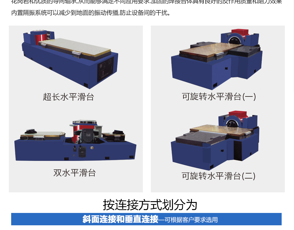用途:振動臺配置水平滑臺可以實現三向振動試驗,也可以配合溫濕試驗箱形成復合環境試驗系統。多軸向水平滑臺可以與任何振動臺配用,為水平方向測試提供最佳的試驗平臺。根據一體化理